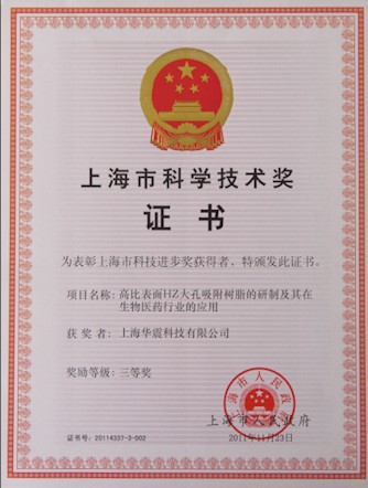 公司高比表面积HZ大孔吸附树脂的研制及其在生物医药行业的应用获上海市科技进步奖